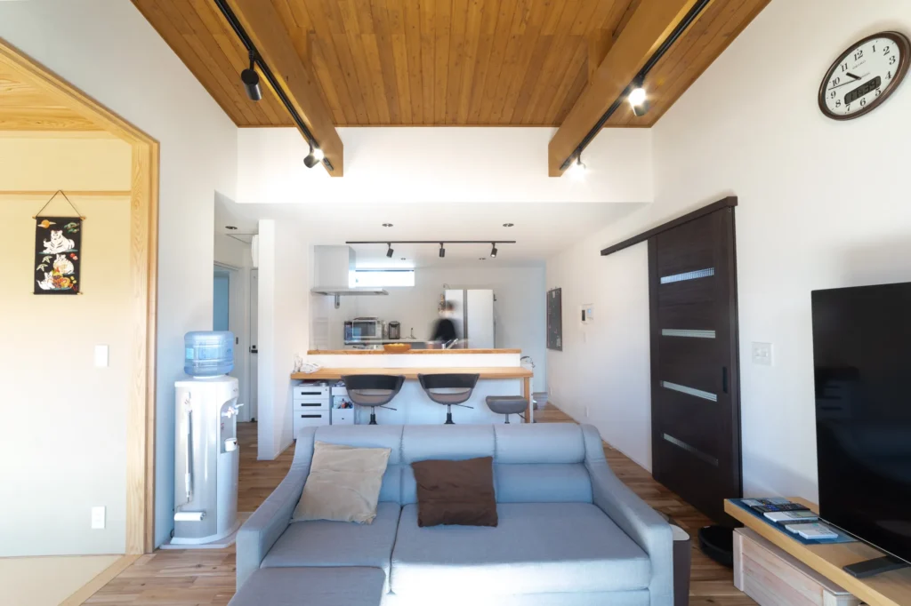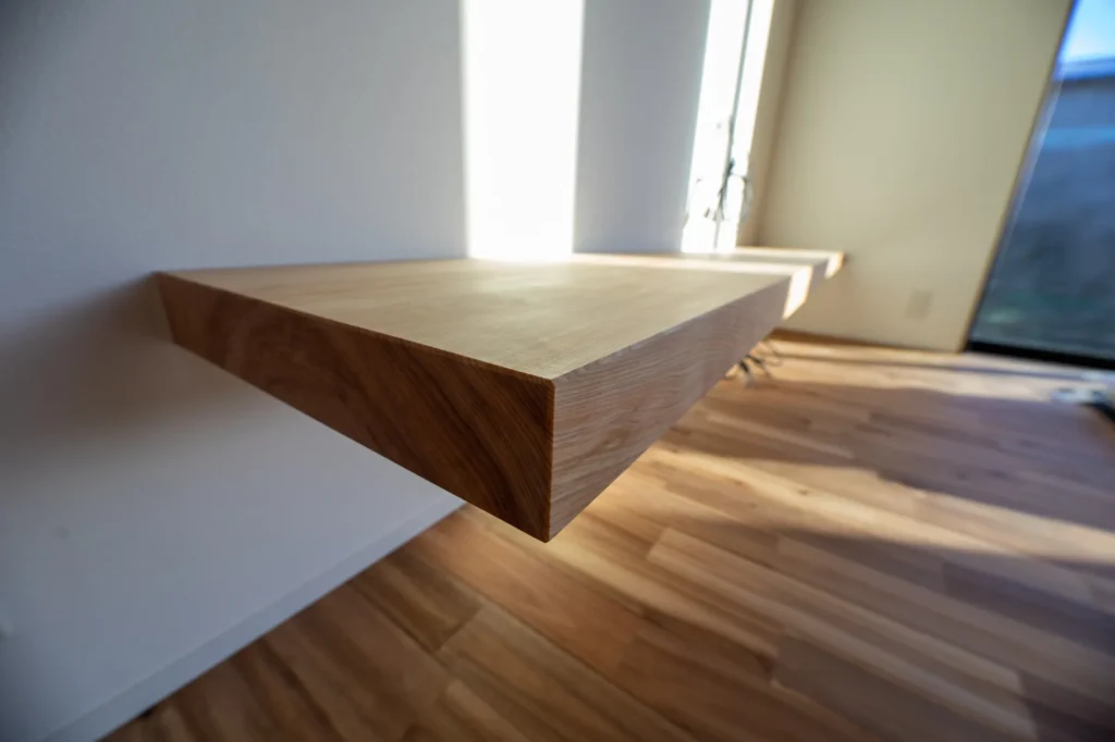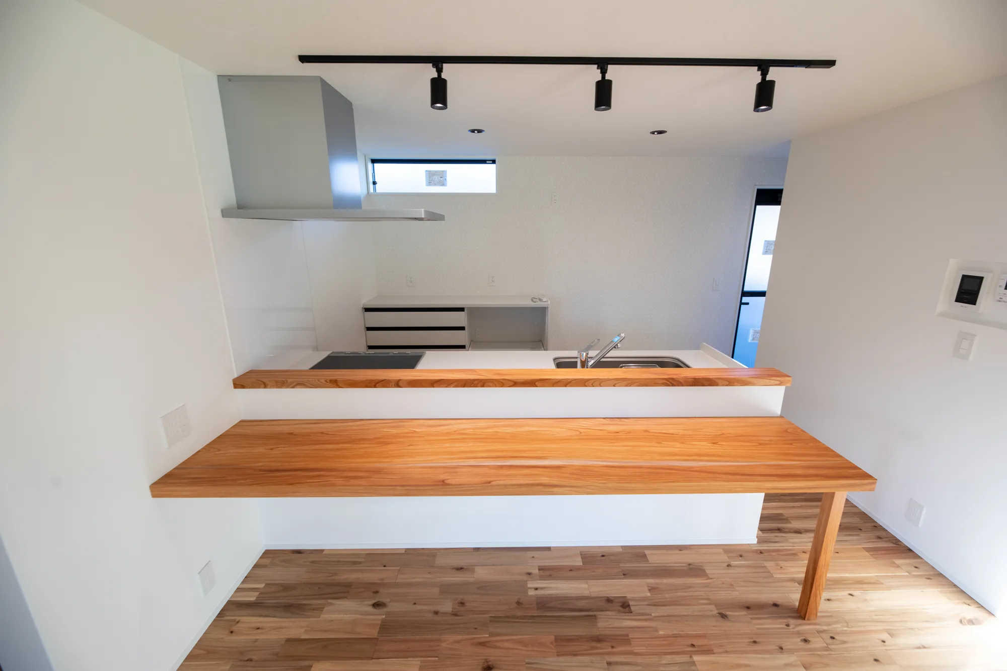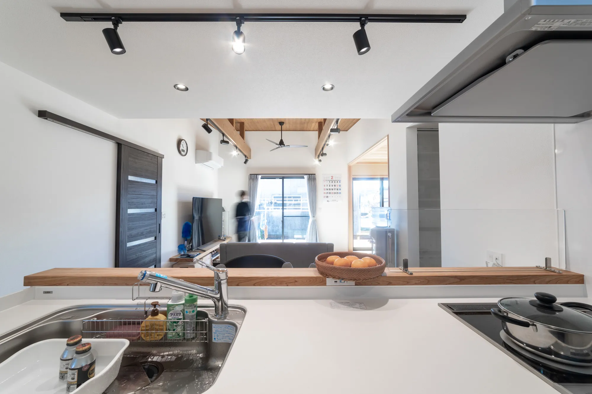 - キッチンに使用した欅のカウンターテーブルはお父様が保管されていたものを使用して制作しました。今回の写真では実際の住環境が整ってからの撮影もさせていただけ、私達が作ったものを、施主さんがどう使っていただけるのか、ほんとうに住みやすい家を提供できたのかが確認でき、ありがたい撮影となりました。