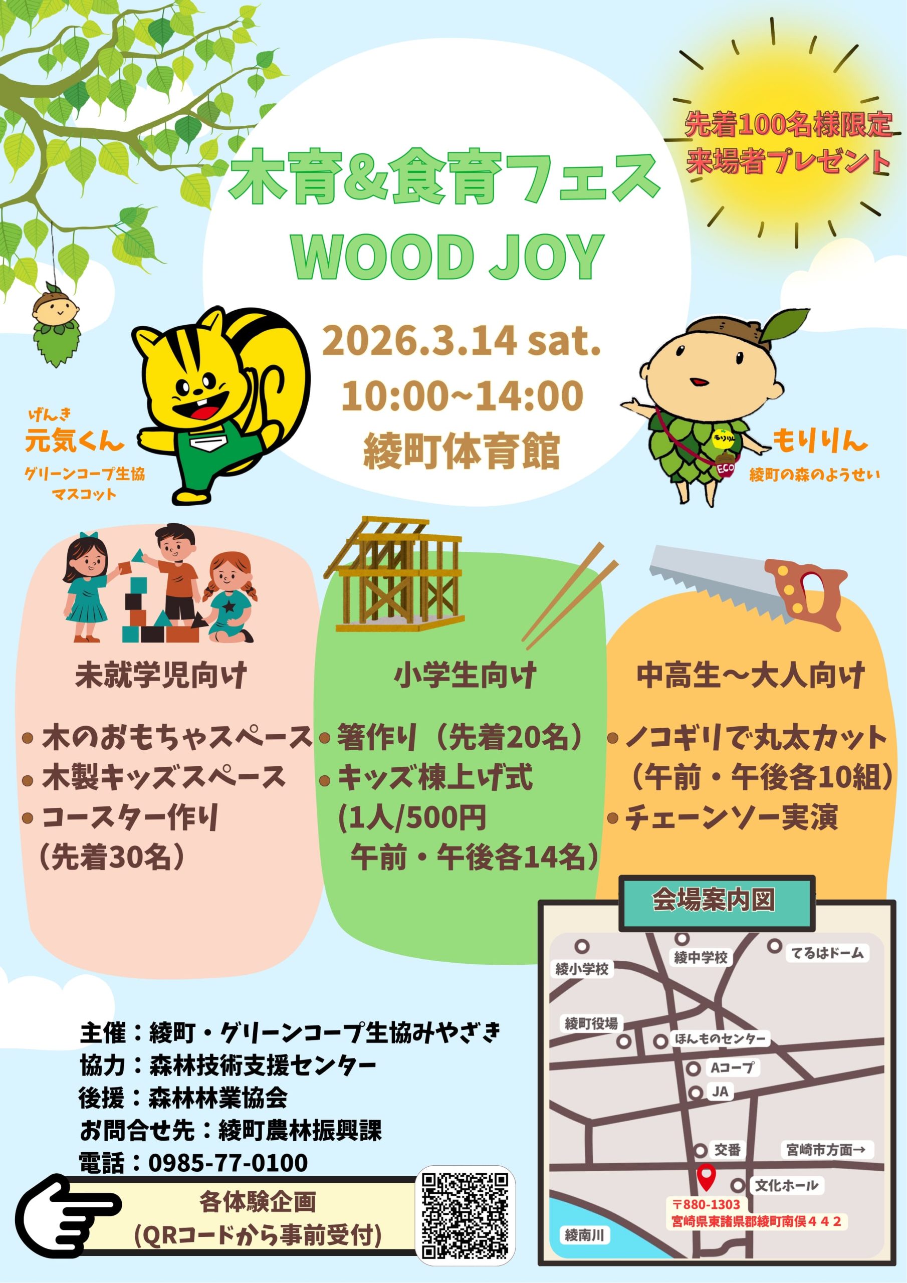 3月14日 イベント出店のご案内 2026.02.10 「木育&食育フェス WOOD JOY」に キッズ棟上げ式を出店いたします。 日 時:2026年3月14日(土) 午前の部 10:00~ 午後の部 12:30~ 場 所:綾町体育館 対 象:小学生以上 参加費:1人/500円 ぜひ遊びに来てください! ↓詳しくはチラシをご覧ください↓ 前のページ 一覧TOP
